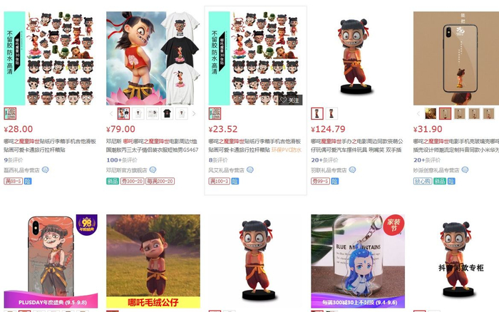 电商平台上搜索“哪吒衍生品”后出现的各种未经授权的产品。