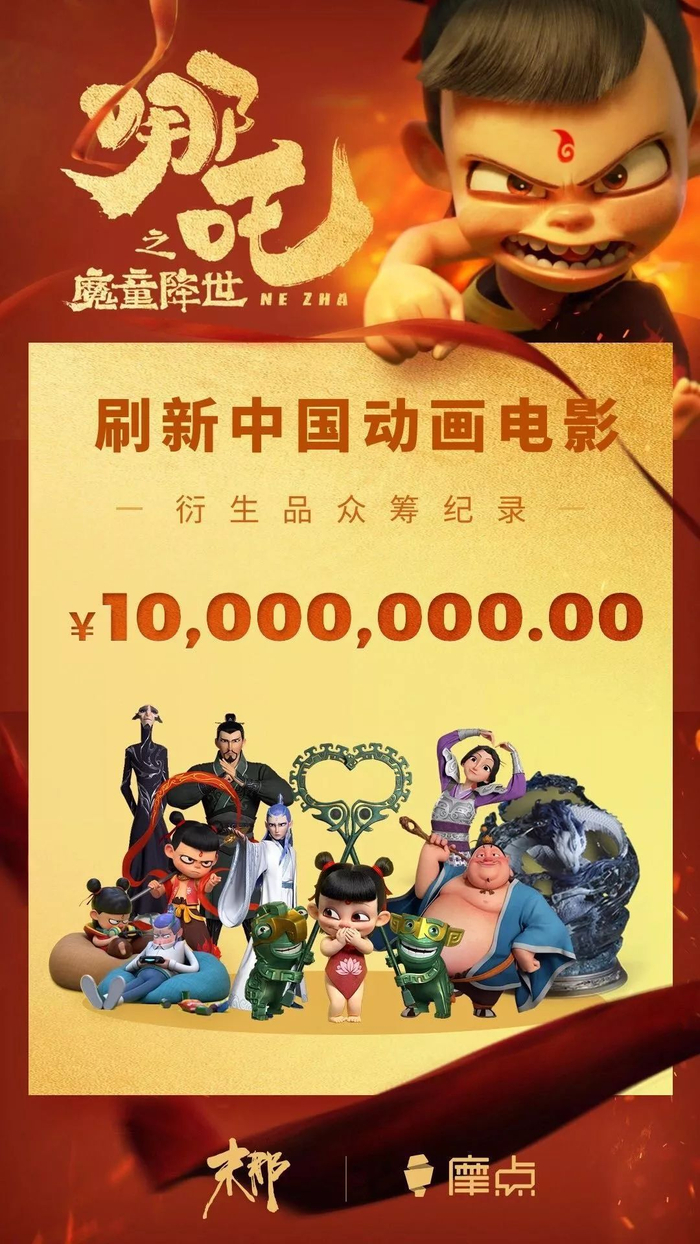 7月28日,《哪吒》电影官微公布了“与国漫一同成长”的电影周边众筹计划,透露将陆续众筹开发包括徽章、挂件、钥匙扣、海报等周边产品。截至发稿日,其官方授权手办众筹突破1000万,还推出了官方授权的电影角色手办及艺术家合作款,制作精细度和价位逐渐提高。