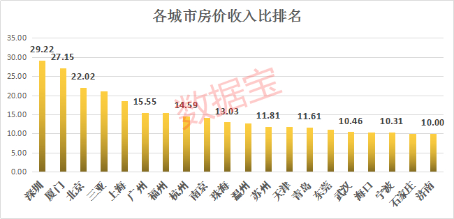 厦门买房负担全国第二。数据显示,厦门2017年平均收入75452元,房价收入比27.15倍。北京第三位,售价收入比22.02倍。此外,三亚、上海、广州、福州、杭州、南京、珠海等城市房价收入比位居第四至第十位。