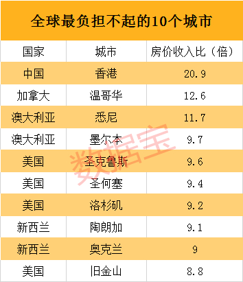香港已经连续9年蝉联全球最贵房价榜首,房价收入比20.9倍,遥遥领先。另一个全球金融中心,纽约房价收入比却要低得多。其房价中位数是43.5万美元,家庭收入中位数是7.85万美元,那么它的房价收入比就是5.5。即纽约的房价中位数,是普通家庭年收入中位数的5.5倍!