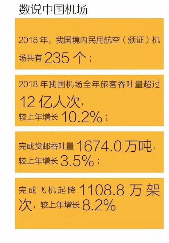 2018 年民航行业发展统计公报显示,截至2018年底,我国共有颁证运输机场235个,而全年新开工、续建机场项目174个,新增跑道6条、停机位305个,航站楼面积133.1万平方米。