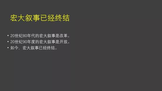 第一个原因,是因为宏大叙事已经结束。我们过去习惯的都是宏大叙事,20世纪80年代我们讲的宏大叙事是改革,但是你要注意,在当时的时候并不是所有的改革都成功,我们的农村改革非常成功,后来我们到城里想如法炮制,我们想去做城市里面的国有企业的改革,其实并没有那么成功。
