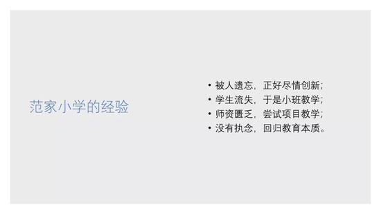 那就奇怪了,为什么会发生这样的变化呢?因为最薄弱的环节往往是突破口。由于范家小学是一个被大家遗忘的角落,没有人关心它,所以,怀有理想主义的校长和老师才能够在这个地方尽情地去做创新和尝试,不会受到很多管理体制的束缚。