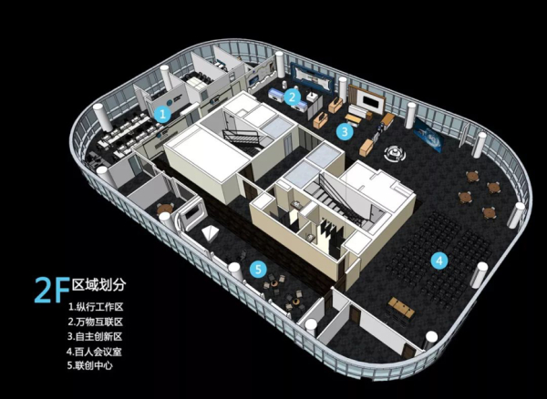 二层的5G联创中心平台,全球或全国具有影响力的企业(包括华为、纵行科技、Lora、欧朗、地平线、天维迅达、英翼等)和行业联盟(上海5G创新发展联盟、长三角5G创新发展联盟)在此集聚,围绕以5G为代表的新一代信息技术开展联合创新,重点聚焦5G+物联网、5G+VR/AR/MR两大领域实现突破;