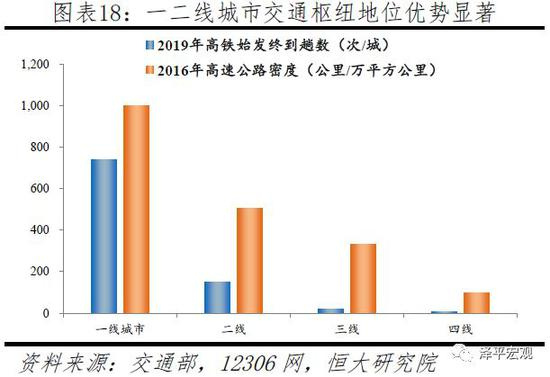 在交通区位方面,一二线城市占据交通枢纽地位,高铁日始发终到趟数分别高达740、149趟,东部地区受益于自然地理和率先发展战略交通基础条件更优。从自然地理看,东部沿海地区具有先发的区位优势。在东部率先发展战略下,高铁、高速公路等交通基础设施发展迅速,特别是珠三角、长三角、京津冀等地区。从高铁通达度看,一线、二线、三线、四线城市高铁日均通行班次分别为974、460、155、54趟;目前尚有107个城市未开通高铁,主要分布在中西部地区。从高铁日始发终到趟数看,一线、二线、三线、四线城市分别平均为740、149、17、6趟,其中广州、上海、北京、深圳、成都、武汉、重庆、天津、长沙、西安位居全国前十。从高速公路看,一二线城市与三四线城市的路网密度差异仍然十分明显,分别为1001、506、330、99公里/万平方公里,四线城市仅为一线城市的10%。2016年国家发改委《铁路网中长期规划》要求,在“四纵四横”高速铁路的基础上,建设形成以“八纵八横”主通道为骨架、区域连接线衔接、城际铁路补充的高速铁路网。其中八纵是指沿海通道、京沪通道、京港(台)通道、京哈~京港澳通道、呼南通道、京昆通道、包(银)海通道、兰(西)广通道;八横是指绥满通道、京兰通道、青银通道、沿江通道、沪昆通道、厦渝通道、广昆通道。