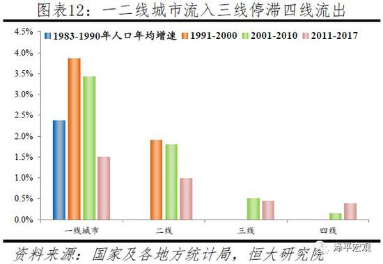 从分线城市看,人口持续向一二线大城市流入,三线城市全域流入流出基本平衡,四线城市持续流出。1982-2017年,一线、二线城市人口年均增速均显著高于全国平均水平,且一线城市增速更高,表明人口长期净流入、且向一线城市集聚更多。其中,1991-2000年、2001-2010年、2011-2017年,一线城市人口年均增速分别为3.9%、3.4%、1.5%,二线城市分别为1.9%、1.8%、1%,表明2011年以来一二线城市人口流入放缓但仍保持集聚,放缓的原因包括京沪控人、人口老化农民工回流等。上述三个时期,三四线合计人口年均增速分别为0.63%、0.29%、0.44%,而全国人口平均增速为1.04%、0.57%、0.52%,表明2011年以来人口虽有回流但仍在持续净流出。其中,2001-2010年、2011-2017年三线城市人口年均增速分别为0.50%、0.44%,基本持平于全国0.57%、0.52%的人口增速;四线城市人口年均增速均为0.14%、0.38%,明显低于全国平均水平。