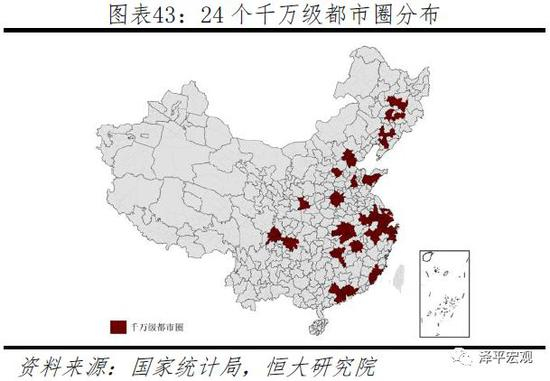 在都市圈层面, 24个1000万人以上的大都市圈以6.7%的土地集聚33%的人口创造约54%的GDP,其中上海、北京、深莞惠、广佛肇等都市圈发展潜力明显居前。鉴于当前多数城市群发育不成熟,且部分核心城市生产要素明显向周边溢出,中央把以大城市为核心的都市圈作为城市群建设的突破口和抓手。2019年2月,国家发改委发布《关于培育发展现代化都市圈的指导意见》,这是中国第一份以“都市圈”为主题的中央文件,要求以大城市及周边地区同城化为方向推进基础设施一体化、强化城市间产业分工协作、加快建设统一开放市场、推进公共服务共建共享等,包括以轨道交通等为基础打造1小时通勤圈。根据有关城市群规划及相关地方规划,当前中国有上海、北京、广佛肇、杭州、深莞惠等10个2000万人以上的大都市圈,有重庆、青岛、厦泉漳等14个1000万-2000万人大都市圈。24个千万级大都市圈以全国6.7%的土地集聚约33%的常住人口,创造约54%的GDP。从发展潜力看,上海、北京、深莞惠、广佛肇都市圈居前,之后则是苏锡常、天津、南京、长株潭、杭州、重庆等都市圈。需要注意的是,部分都市圈范围有重合,比如上海都市圈与杭州都市圈、苏锡常都市圈均有重合。