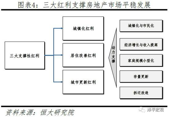在中长期,城镇化、居住改善、城市更新三大红利将支撑中国房地产市场未来平稳发展。一是城镇化红利。2018年中国常住人口城镇化率为59.6%,与发达国家平均约80%的城镇化水平相比仍有较大增长空间,并且户籍人口城镇化率仅为43.4%,市民化空间更是巨大。二是居住改善红利。当前同时拥有厨房和卫生间的城镇住房成套率仅85%,且有20%的家庭居住在条件较差的平房,人均住房使用面积仅不到25平,与发达经济体存在明显差距。随着中国经济持续增长和收入提高,加之家庭规模日趋小型化,人均住房面积还将进一步增长。三是城市更新红利。随着住房存量市场日益庞大,住房存量更新、拆迁改造的规模将持续上升。总体来看,到2030年之前中国房地产市场年均需求将在11-13亿平方米左右,需求虽有下滑,但规模仍然很大。(参见恒大研究院2018年12月报告《传统周期延续,还是长效机制破局?—2019年房地产市场展望》)