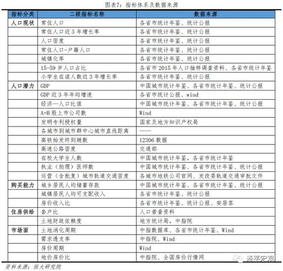 具体来看,我们在基本面关注需求侧的人口现状、人口潜力以及人口购买能力,以及供给侧的住房存量及土地财政依赖度,共涉及23个指标。其中,人口现状分为总量和结构两个维度,后者包括外来人口、人口年龄结构、城镇化率、小学生等指标。基于“人随产业走,人往高处走”的基本逻辑,我们从经济实力、产业创新、交通区位和公共资源四个方面分析人口潜力。除经济总量外,我们以经济-人口比值(区域经济份额/人口份额)作为反映经济层面的总体人口吸引力,以A+H股上市公司数、发明专利授权量反映区域先进产业及创新能力,以高铁始发终到趟数、高速公路路网密度、到中心城市距离等反映交通区位,以在校大学生数、执业(助理)医师数、城市轨道交通里程路网密度反映教育、医疗、公共交通等公共资源情况。在购买能力方面,我们关注绝对水平的人均储蓄存款、人均可支配收入以及相对水平的房价收入比。在供给侧,我们关注套户比和土地财政依赖度两个指标;其中,套户比反映存量住房市场的总体平衡程度,土地财政依赖度反映地方政府对房地产的依赖及与此相关的土地出让偏好。