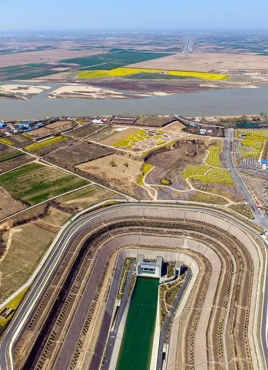 跨越上千千米从长江流域向华北调水的南水北调工程(河南省荥阳市王村镇李村附近的南水北调穿黄工程,一渠“南水”到黄河南岸戛然而止,在地下穿过黄河及一片油菜花田,才重新露出地面,一路向北,图片源自@VCG)▼