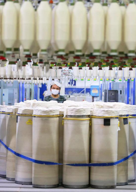 今天中国的纺织工业生产着全球一半以上的棉型织物以及三分之二以上的化纤产品(上述数据源自陈义方《纺织大国崛起历程:中国纺织工业的70年》;下图湖南衡阳一家纺织厂在紧张生产,摄影师@VCG)