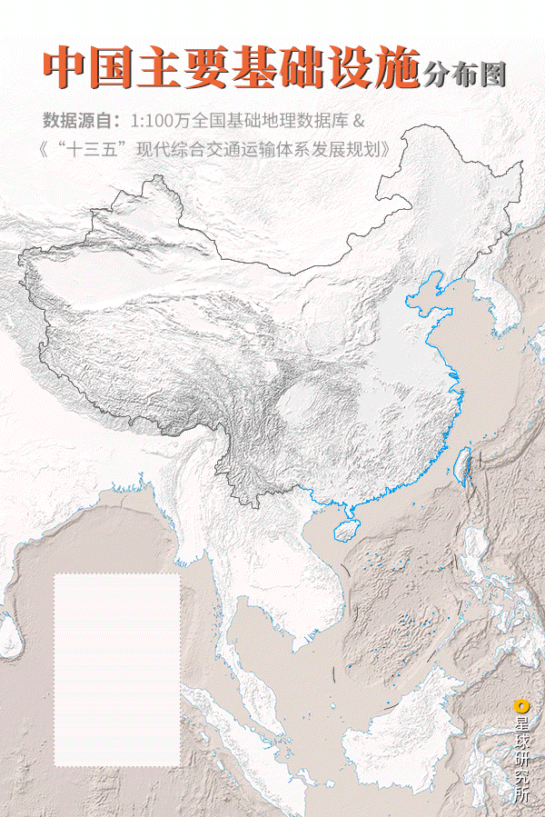 整个中国都被密布的基础设施连结起来(中国主要基础设施分布,制图@巩向杰&张靖/星球研究所)