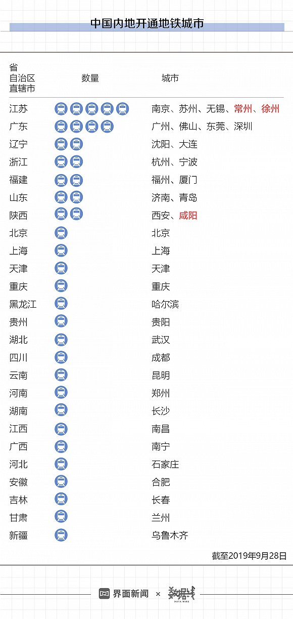 据界面新闻统计,中国内地目前已有37座城市开通地铁,分布在全国25个省份(自治区/直辖市),最新开通的三城分别是徐州、咸阳、常州。