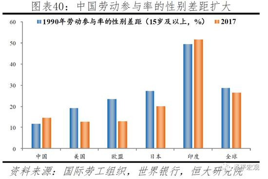 5)女性劳动参与率高但就业权益保障不够,导致生育的机会成本高。根据国际劳工组织统计,1990-2017年中国女性劳动参与率(15岁及以上)从73.2%降至61.5%,大幅下降11.7个百分点,但在全球仍然处于较高水平。2017年全球女性劳动参与率为48.7%,美国、欧盟、日本、印度分别为55.7%、51.1%、50.5%、27.2%。与此同时,尽管中国保护女性就业权益的相关法律法规不少,但职场的性别歧视仍然较为严重,1990-2017年中国女性劳动参与率与男性的差距从11.6个百分点扩大到14.6个百分点,而全球、美国、欧盟、日本男女性的劳动参与率差距均呈缩小态势。