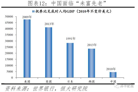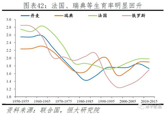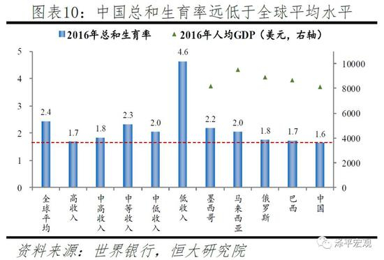 2)中国生育率下降速度前所未有,当前不仅远低于2.45的全球平均水平,还低于1.67的发达国家水平。根据联合国统计,1950-2015年美国总和生育率从3.3降至1.9,日本从3降至1.4,印度从5.9降至2.4,均远小于中国的总和生育率从6到1.6的降幅。2016年中国总和生育率为1.62,在全球位居倒数,不仅远低于2.45的全球平均水平,还低于1.67的高收入经济体水平。与墨西哥、巴西、马来西亚、俄罗斯等人均GDP相近的国家相比,中国总和生育率仍然偏低。