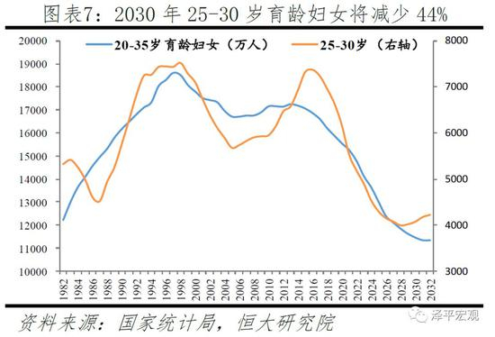 育龄妇女规模已见顶下滑,2030年20-35岁主力育龄妇女规模将比2018年减少29%,其中20-35岁生育高峰期妇女将减少41%,后续出生人口恐将大幅下滑,预计2030年将降至1100多万、较2018年减少26%。在修正人口普查数据中的低龄人口漏登后,我们估计了1982-2030年育龄妇女情况。1982年中国15-49岁育龄妇女规模为2.5亿,到2011年达3.8亿人的峰值,2018年降至3.5亿,预计到2030年将降至3.0亿。其中,20-35岁的主力育龄妇女从1982年约1.2亿增至1997年1.9亿的峰值,到2018年降至近1.6亿,预计到2030年将降至1.1亿;25-30岁生育高峰期妇女2018年约7000万,预计到2030年将降至约4100万,降幅约41%。在此背景下,预计2030年出生人口将降至1100多万。