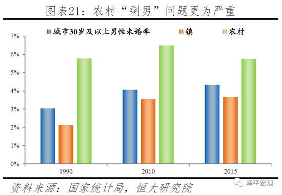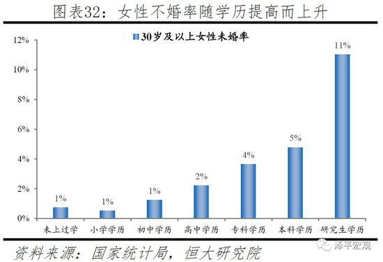 2)因婚姻市场匹配问题及单身主义等,“剩女”规模快速增加至约600万,学历越高“剩下”的概率越大。在婚姻市场中,女性多偏好不低于自身条件的男性,男性多偏好不高于自身条件的女性。这意味着即便婚姻市场男女性别比平衡,条件最好的女性和条件最差的男性也最有可能被剩下。1990年中国30岁及以上未婚女性仅为46万,2000年超过154万,2015年攀升至590万;其中,30-34岁女性未婚率从0.6%攀升至7.0%。从城乡分布看,2015年城市30岁及以上女性未婚率为2.4%,明显超过建制镇的1.0%、农村的0.9%。从受教育程度看,30岁及以上研究生学历女性未婚率高达11%,远高于本科学历及以下女性未婚率的5%。