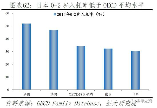 3)完善的儿童托幼服务体系,法国2014年0-2岁入托率达51.9%,远高于OECD水平。法国的儿童托幼服务体系齐全,包括:集体托儿所等集体接待机构、幼儿园助理等家庭接待机构;保姆等家庭看护、“娱乐接待员”等。无论采取哪种方式,法国家庭津贴基金(CAF)都会提供资助,如请保姆到家中照顾孩子,雇主最少仅需出15%的费用。根据OECD数据,2014年法国0-2岁入托率为51.9%,在所有OECD国家中排名第八,高于OECD平均水平的34.4%。