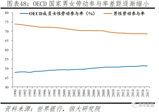 第四,加强女性就业权利保护,男女就业差距越小,生育率越高。OECD国家重视女性就业权利保护,如瑞典政府主导的公共服务事业为女性提供了大量的就业岗位,德国、韩国、日本、新加坡都为产后女性的再就业提供培训等。根据世界银行,1990-2017年OECD成员女性劳动参与率(15岁及以上)从47.8%上升至51.3%,男女劳动参与率差距从26.1个百分点降至17.2个百分点。一般而言,男女就业差距越小的国家,意味着女性的就业权利得到了更好地保障,生育率越高。如2014年瑞典男女就业率差距仅为3.4个百分点,总和生育率为1.88;而意大利男女就业率差距为18.2个百分点,总和生育率仅为1.37。2006-2016年OECD国家的男女收入中位数差距从15.6%下降至13.5%。1990-2017年中国女性劳动参与率从73.2%降至61.5%,劳动参与率差距从11.6个百分点扩大到14.6个百分点。