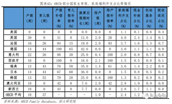 国际经验:鼓励生育效果如何?1)OECD经验:鼓励生育哪招最管用?OECD国家鼓励生育政策体系主要涵盖保障休假、经济补贴、托幼服务、女性就业支持等四个方面。其中,休假长度和生育水平相关性弱,其中原因在于延长女性休假时间与保障其就业权益存在一定矛盾。家庭福利开支比例与生育水平有一定相关,2013年OECD国家家庭福利开支与GDP的比例平均约2.4%。入托率与生育水平有一定相关,0-2岁入托率越高,生育水平越高,OECD国家0-2岁平均入托率为34.2%。女性就业权益保护与生育水平有一定相关,男女就业差距越小,生育水平越高。2)法国:积极推进家庭和工作的平衡,总和生育率接近2。法国早在二战前就开始鼓励生育,通过完善细致的津贴体系、多样化的托幼服务和打造家庭友好型企业氛围等来实现工作和家庭的平衡,2016年总和生育率达1.96。2013年法国家庭福利开支占GDP比重达3.7%,在OECD国家中排名第三;2014年0-2岁入托率达51.9%,远高于OECD水平。法国大企业携手打造家庭友好型企业氛围,男女劳动参与率差距不到10%;此外,占比约9%的移民对法国生育率回升也起到一定作用。3)日本:传统性别分工激化工作与家庭矛盾,总和生育率停留在1.4左右,人口形势严峻。日本在1970年代之前一度控制人口,1990年代开始鼓励生育,但2016年总和生育率仍停留在1.4,低生育率导致日本人口于2008年见顶、2100年将比峰值减少53%,并且老龄化高龄化程度为全球之最。原因在于:一方面日本错过了调整生育政策的最佳时机。二是日本鼓励生育力度较弱,家庭福利开支占比仅1.5%,在OECD国家中排名倒数。三是日本“男主外、女主内”性别分工较为普遍,职场性别歧视严重,越来越多日本女性放弃结婚生育,1990-2015年50岁以上女性终身未婚率从4.3%激增至14.6%。