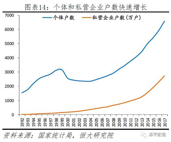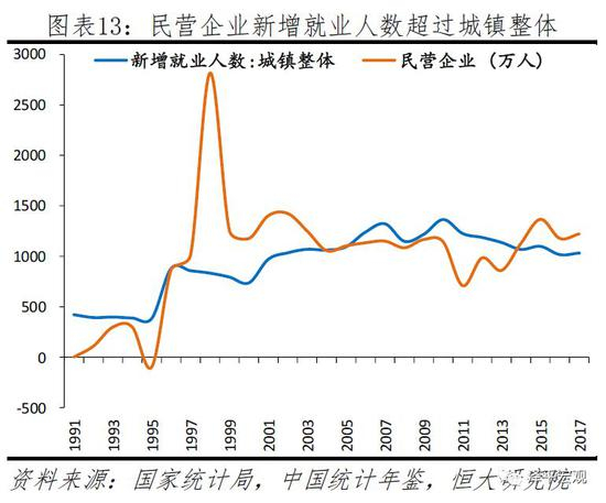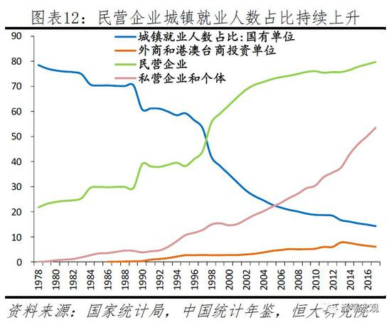 民营企业是城镇就业的最大保障。1978年城镇就业人数9514万人,其中国有单位和城镇集体单位分别为7451万人和2048万人,而个体经济仅有15万人,占比0.16%。2017年城镇就业人数42462万人,其中私营企业和个体经济占比53.4%,全部民营企业占比近80%,增量占比更是超过100%。