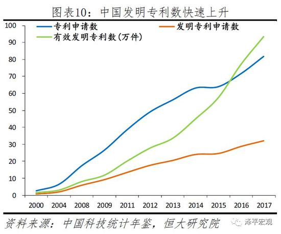 3)民营企业发明专利占比超75%,民营企业是中国科技创新的主力军。2000-2017年,中国规模以上工业企业专利申请数、发明专利申请数和有效发明专利数分别由2.62、0.80和1.53万件快速上升至81.70、32.06和93.40万件。2017年,民营企业专利申请数占比77.8%,发明专利申请数占比77.4%,有效发明专利数占比75.8%。