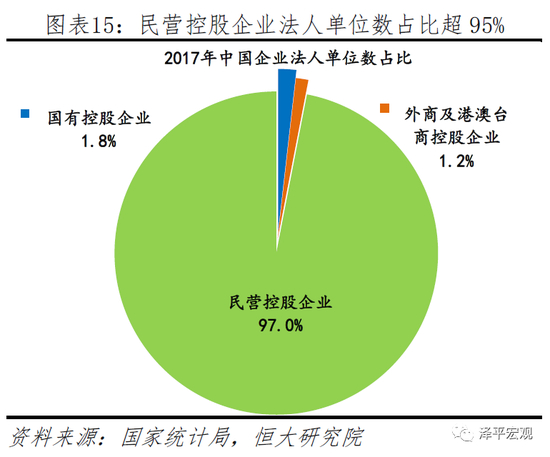 民营企业是中国经济微观基础的最大主体。1978年,全国个体工商户只有15万户,没有私营企业;2017年,个体工商户增长至6579.37万户,私营企业增长至2726.28万户。2017年,全国企业法人单位数为1809.77万个,其中国有控股企业占比1.8%,外商及港澳台商控股企业占比1.2%,民营控股企业占比97.0%。