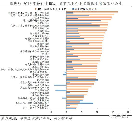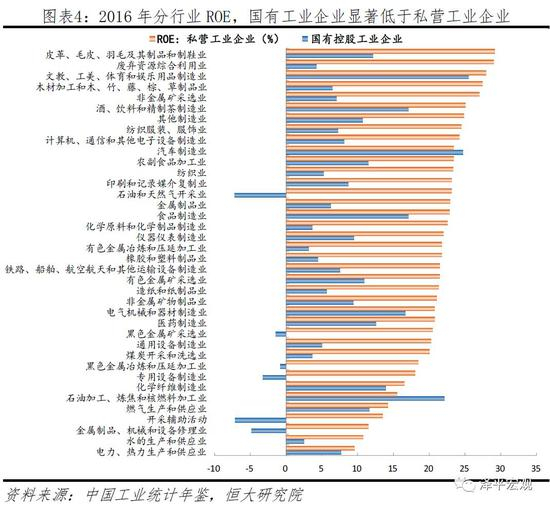 在绝大部分行业中,国有控股工业企业的ROA和ROE都要显著低于私营工业企业。在黑色金属矿采选业、石油和天然气开采业等垄断性较强的上游行业,国有企业甚至出现亏损。国有企业仅在汽车制造业与石油加工、炼焦和核燃料加工业存在相对优势。