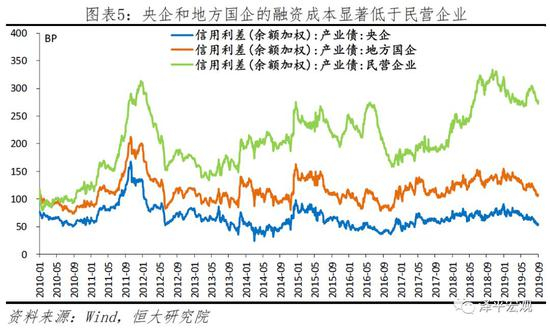 3)融资上民营企业受到一定程度的所有制歧视。国有企业享受政府隐性担保,预算软约束使其具有大幅举债的投资冲动,金融机构也愿意为其提供充足且廉价的资金支持,对民营企业造成挤出。近期在金融去杠杆、信用扩张放缓的背景下,民企融资环境恶化。民营企业贡献了国民经济的“56789”,却只占用了40%左右的信贷资源,与其经济贡献完全不匹配。