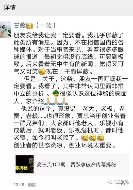 顾颖琼在爆料中似乎有意反问“甘薇你为什么要和我的偶像贾跃亭离婚?”,并在最后称“贾跃亭真是一个负责温情的男人!”