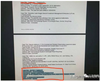 在这份法庭文件截图中,包含多个诉讼案,除了贾跃亭和甘薇的离婚案,图片最上方还有顾颖琼和贾跃亭的诉讼案。