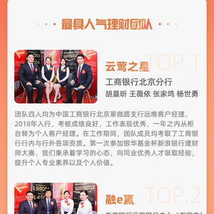 来自中国银行东莞分行的吴贤生理财师以118557的票数遥遥领先,高居个人组榜首。而团队赛中,来自工商银行北京分行的云莺之星团队更是获得了103365票的优异成绩,成功摘得团队组人气票选桂冠。