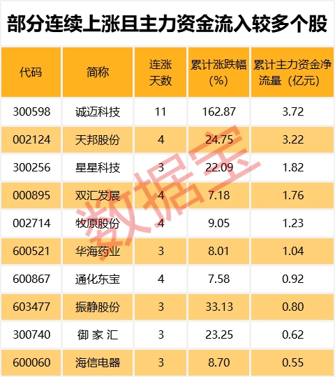值得注意的是,109只连续上涨个股中,6只个股期间主力资金累计净流入超过亿元。其中,累计资金流入最多的为诚迈科技,主力资金累计流入3.72亿元。