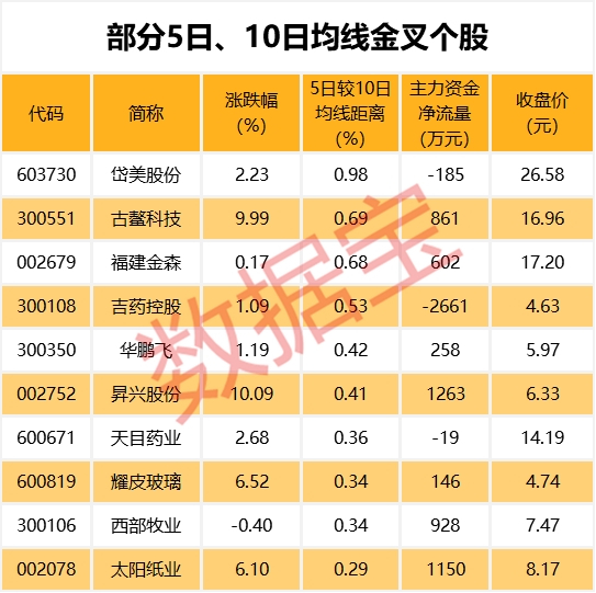 截至10月22日收盘,有22只A股的5日均线主动上穿10日均线,其中岱美股份、古鳌科技、福建金森等个股的5日均线较10日均线距离最大,分别达0.98%、0.69%、0.68%。值得注意的是,云天化、昆药集团、东华软件等个股主力资金净流入居前。