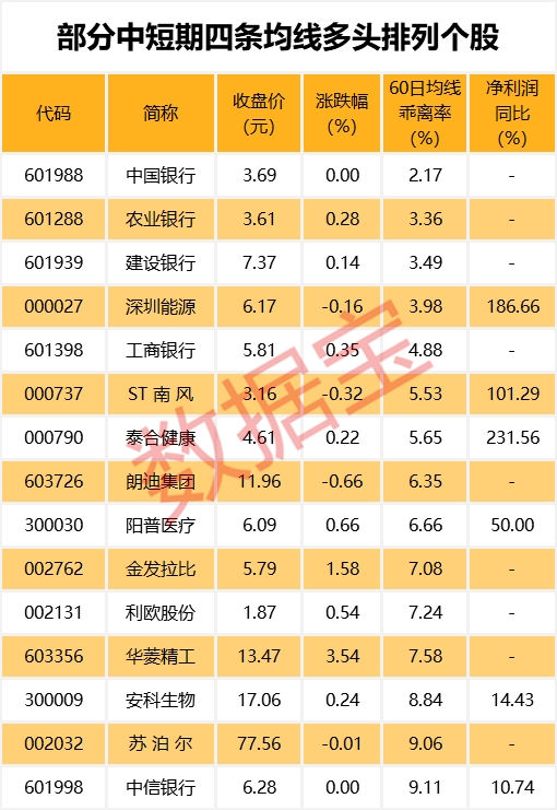 在5日、10日、20日、60日四条近日形成多头排列的个股当中,25只2019年三季度业绩净利润同比增幅超过五成,国光电器、金字火腿、牧原股份等个股业绩增幅最大,分别为600.74%、316.38%、296.04%。
