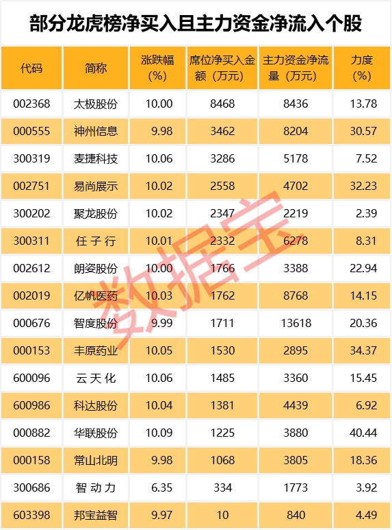 从盘口资金流向来看,主力资金净流入超千万且龙虎榜净买入个股共有15只,其中智度股份、亿帆医药、太极股份等个股资金净流入金额最大。净流入力度最大的个股有华联股份、丰原药业、易尚展示,净流入力度分别为40.44%、34.37%、32.23%。
