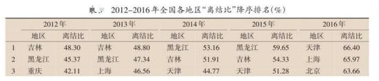 吉林大学东北亚研究中心副教授李雨潼曾做过东北地区离婚率全国居首的原因分析,从其统计的2012年~2016年全国各地区离结比排名来看,东北三省的离结比比例一直居高不下。其中,在2014年,黑龙江和吉林的离结比就率先突破了50%,当年两省的离结比分别为:53.16%、51.91%(编者注:离结比和离婚率统计方式不同,不能简单等同,但趋势相同)。