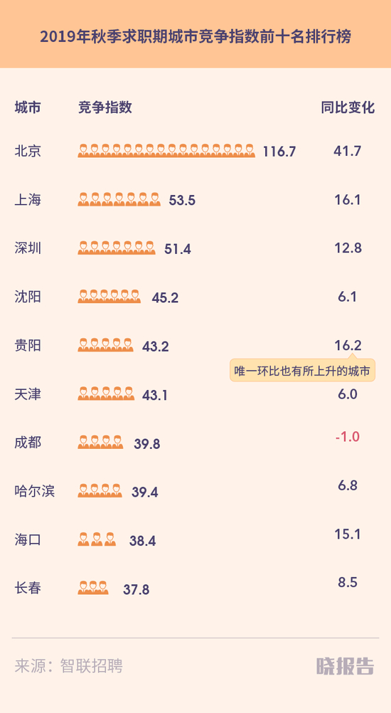 而另一座一线城市广州,反倒是因为人才市场的竞争不够激烈,没能入围求职热门城市。
