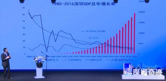 这个过程我做了一个图,下边的线是全国,上边这条曲线是深圳,然后我做了一个平滑,平滑就可以看到深圳是一路降速的。在深圳的这条曲线中,每十年大概有一个周期。中国人特别怕周期,讲周期危机是资本主义,其实我觉得周期是个创新的过程。高潮时大家投资,看到一个风口猪都能飞起来,大家都去投,投了之后就会看到大量飞起来的猪死了,真正的鹰飞起来了。