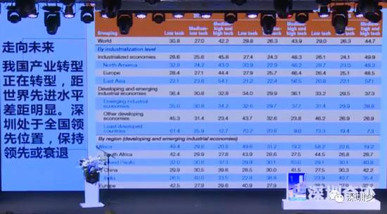 联合国刚刚发布的报告,横向从2005年到2015年,纵向把每一年的产业分成低端、中低端、高端。我们可以看中国的变化,在过去十年我们的中高端产业上升了2.6个点,到目前为止,我们明显高于发展中国家的平均水平,接近高收入国家的边界。当然,和日韩比、和发达国家比还是有差距,这是我们要转型的方向。深圳的未来要转型、要提升,你很出色很成功走到了今天,但是停在今天不会有出路。