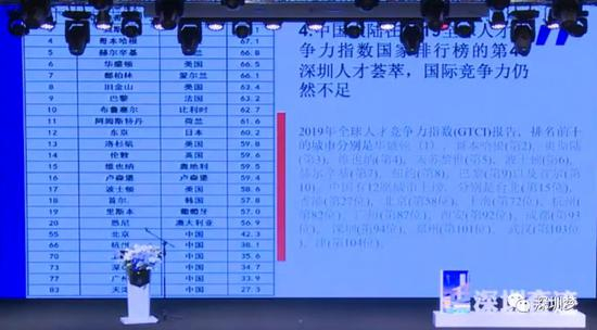中国的创新人才指数在全球也就排45,深圳人才荟萃,但是在全球的排名一次排73、一次排94。我想说的是过去15年深圳发生重大变化的是450万企业劳动力,平均受教育年限已经从7年达到了13年,15年达到了别的国家100年的变化,但是人才也就如此。