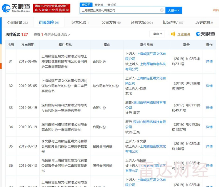 雷达财经查询发现,除了被旗下主播起诉,熊猫互娱还涉及多种类型纠纷。截至目前,公司共涉及127起诉讼。