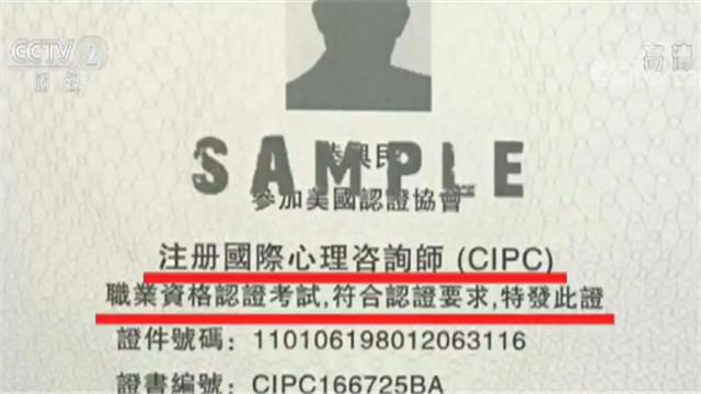 中国心理学会心理咨询师工作委员会专家林春:“你动动脑子,用脚掌想想也都知道这是假的。既不为政府部门承认,也不会被我们国内的心理学的行业组织所认可。”