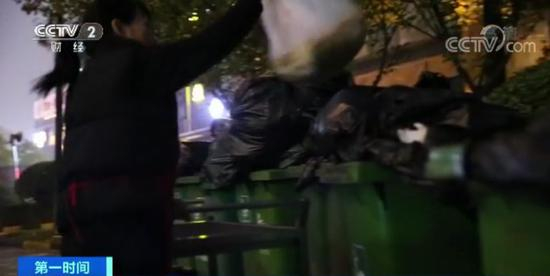 夜幕降临,橡树社区的垃圾台随意堆放的垃圾越来越多。正在拍摄中,有一位饭店服务员拉着一车垃圾,面对镜头很淡定地随意把垃圾一丢,扔在已经溢出的垃圾桶上,扬长而去。