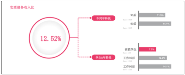 通过每月待还款金额占月收入的比重可测算,中国年轻人平均债务收入比为41.75% ,其中13.4%的年轻人零负债。如果扣除掉消费信贷作为“支付工具”的部分,那么年轻人的实质债务收入比将降为12.52%;在校大学生的实质债务收入比为7.5%。