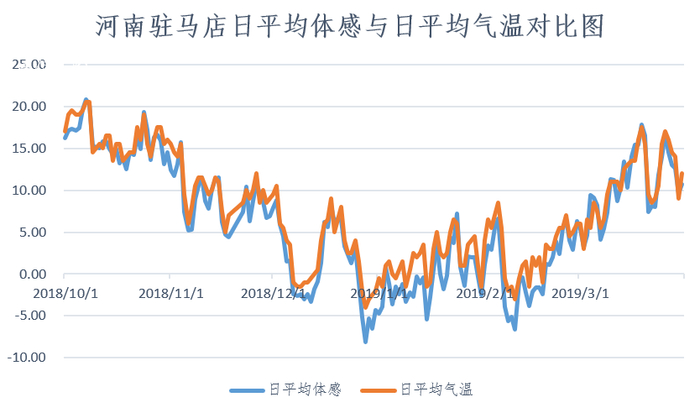 以河南省驻马店市和信阳市2018年10月至2019年4月为例,可以发现,这两个毗连城市的日平均体感温度和日平均气温数值和走势都较相近,体感温度略低于实际气温。另外,需要指明的是,因为体感温度还和个人体质相关,计算公式也是千差万别,因此在不同的天气网站,同地同时的体感温度也会有所不同,体感温度个人差异较大,仅供参考。