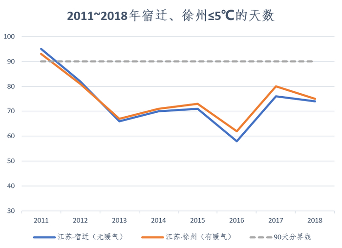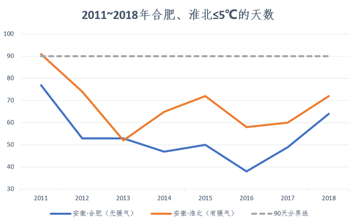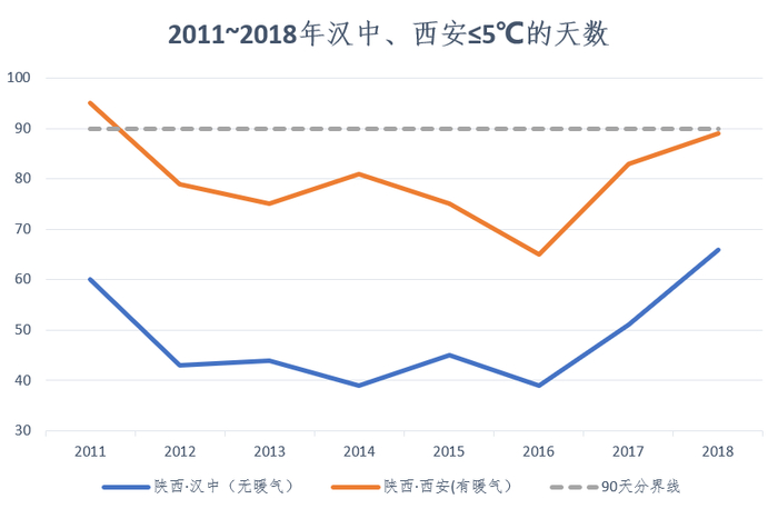 近年来,所选择的8个临近供暖线的城市均未能达到最初制定的集中供暖标准(即日均气温不超过5℃的天数高于90天)。毗连城市冬季气温相近,但同省有暖气的城市确实相对较冷。