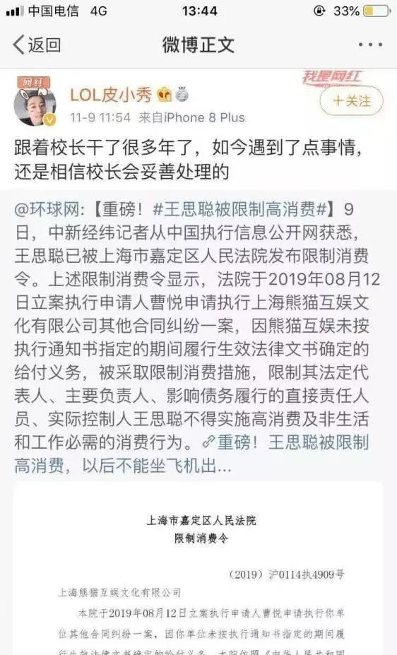 11月9日,微博认证为“LOL皮小秀”的博主转发了王思聪被限制高消费的相关新闻,并附言“跟着校长干了很多年了,如今遇到了点事情,还是相信校长会妥善处理的”。