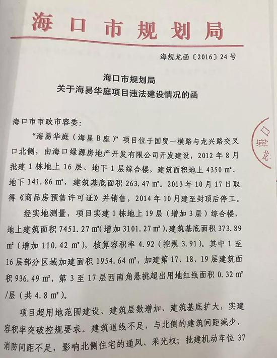 记者也从海口市规划部门2016年4月出具的一份材料中获悉,经实地测量,海易华庭项目实建1栋地上19层综合楼,在原报建的基础上增加了3层;地上建筑面积7451.27平方米,增加了3101.27平方米;建筑基底面积也增加了110余平方米,核算容积率达4.92(控规3.91)。