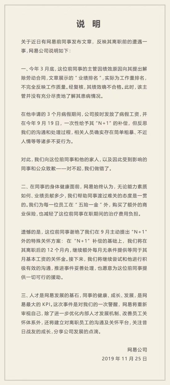 11月25日,在网易游戏前员工遭“暴力裁员”并在网上发布了一篇名为《网易裁员,让保安把身患绝症的我赶出公司。我在网易亲身经历的噩梦!》的文章进行控诉后,网易对外做出正式回应,并向该员工致歉。随后不久,网易又再次发布一封面向内部员工的内部说明,对事件前后经过进行梳理。经网易复核后表示,该被裁员工绩效确不合格。